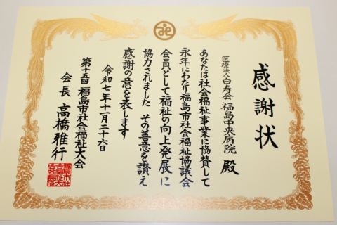 お知らせ ホーム > お知らせ > 福島中央病院 > 第15回福島市社会福祉大会受賞 第15回福島市社会福祉大会受賞 2025/11/27 この度、昨年に続き第15回福島市社会福祉大会において、感謝状をいただきました。 これからも、引き続き協力して参ります。 カテゴリー 福島中央病院(11) エルダーランド(3) エルダーランド在宅(1) 吉井田地域包括(1) 最近の投稿 第15回福島市社会福祉大会受賞 令和6年度交通事故防止コンクール表彰 厚生労働大臣表彰受賞 防犯対策訓練を行いました。 令和5年度介護職員処遇改善計画書を公表します。 月別投稿一覧 月を選択 2025年11月 (1) 2024年12月 (1) 2023年9月 (1) 2023年6月 (1) 2023年2月 (1) 2022年12月 (1) 2022年11月 (1) 2022年5月 (1) 2022年4月 (1) 2022年3月 (1) 2020年12月 (4)